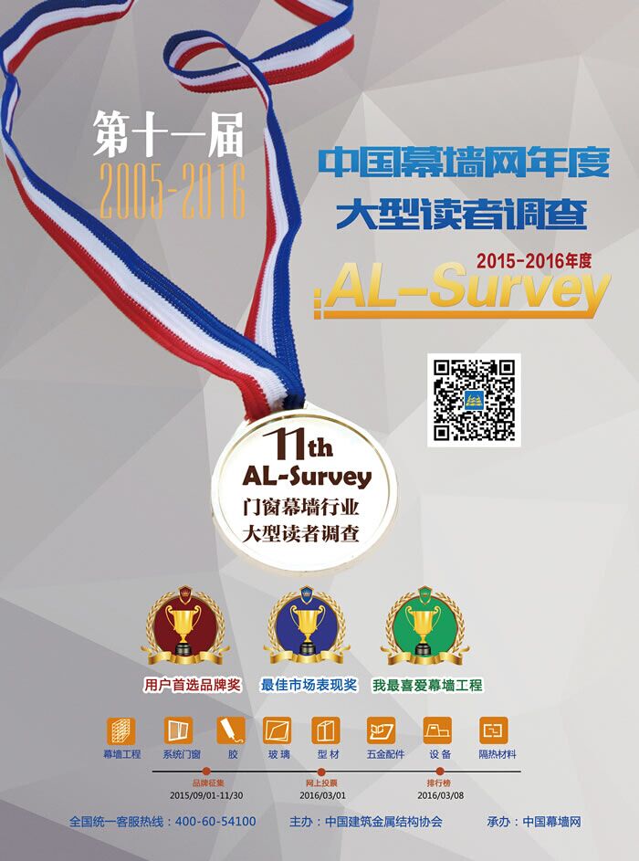 AL-Survey讀者調(diào)查活動(dòng)全稱:中國(guó)幕墻網(wǎng)年度大型讀者調(diào)查活動(dòng)暨“我最喜愛(ài)品牌”評(píng)選活動(dòng)。(以下簡(jiǎn)稱AL-Survey)我司作為設(shè)備領(lǐng)域的領(lǐng)先企業(yè),自上界獲得用戶首選品牌及市場(chǎng)表現(xiàn)獎(jiǎng)之后,2015年再次憑借“天辰鋁機(jī)”品牌在市場(chǎng)中的優(yōu)異成績(jī),強(qiáng)勢(shì)入圍2015-2016年度第11屆門窗幕墻品牌榜活動(dòng)。通過(guò)近十萬(wàn)名活動(dòng)參與者的票選,AL-Survey將成為我司年度市場(chǎng)品牌推廣與產(chǎn)品銷售、服務(wù)質(zhì)量的晴雨表。