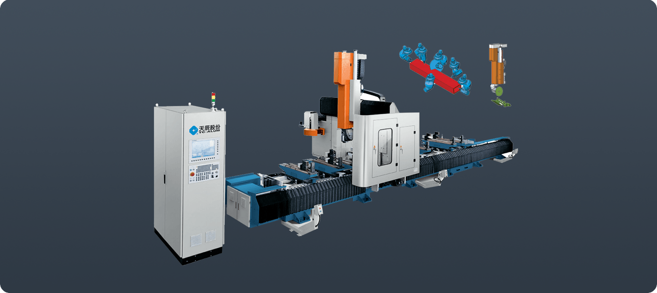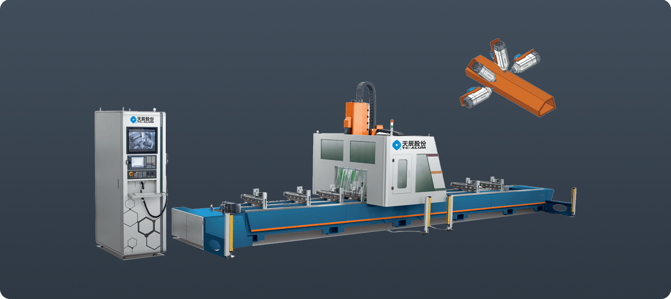 用于門窗幕墻鋁型材及工業(yè)型材的孔、槽及輪廓形狀等復(fù)雜工序的加工,具備銑削、鉆削、攻絲、切割等功能,實(shí)現(xiàn)5面加工,5軸RTCP插補(bǔ),可實(shí)現(xiàn)復(fù)合切割。